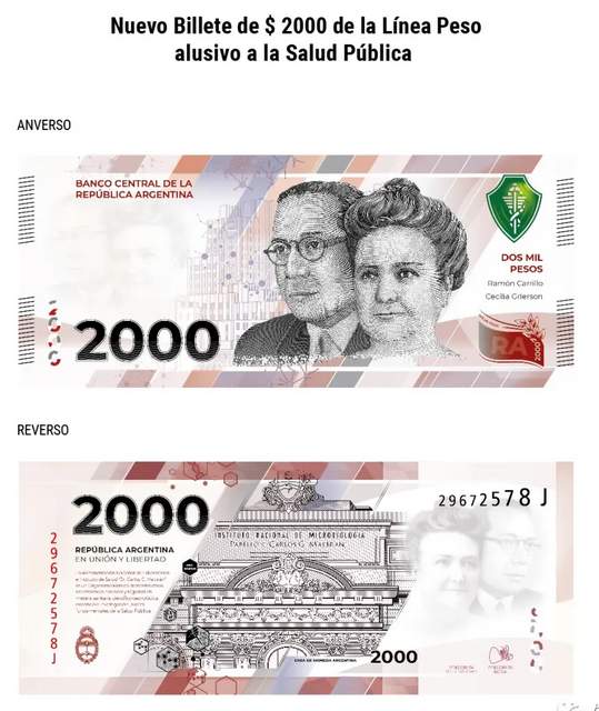 The new edition of 2000 pesos, entitled "The Development of Science and Medicine in Argentina", features portraits of Argentine medical pioneers Cecilia Grierson and Ramón Carrillo on the obverse and a partial exterior of the National Institute of Microbiology of Dr. Carlos Gregorio Marbran, on the reverse. Cecilia Grierson is an Argentine physician and women's rights supporter, and the first woman in Argentina to earn a medical degree. He was the Vice-President of the International Council of Women and founded the first nursing school with a formal curriculum in Argentina and Latin America, and was a founding member of the Argentine Medical Association. Dr. Ramón Carrillo was a neurosurgeon, neurobiologist, health doctor and the first Minister of Health of Argentina, who worked on the development of social medicine (health), starting from the social concept of medicine, which brought about a great transformation of public health in Argentina. He is recognized for his ideas, principles and foundations of action that "all people have an equal right to life and health".
